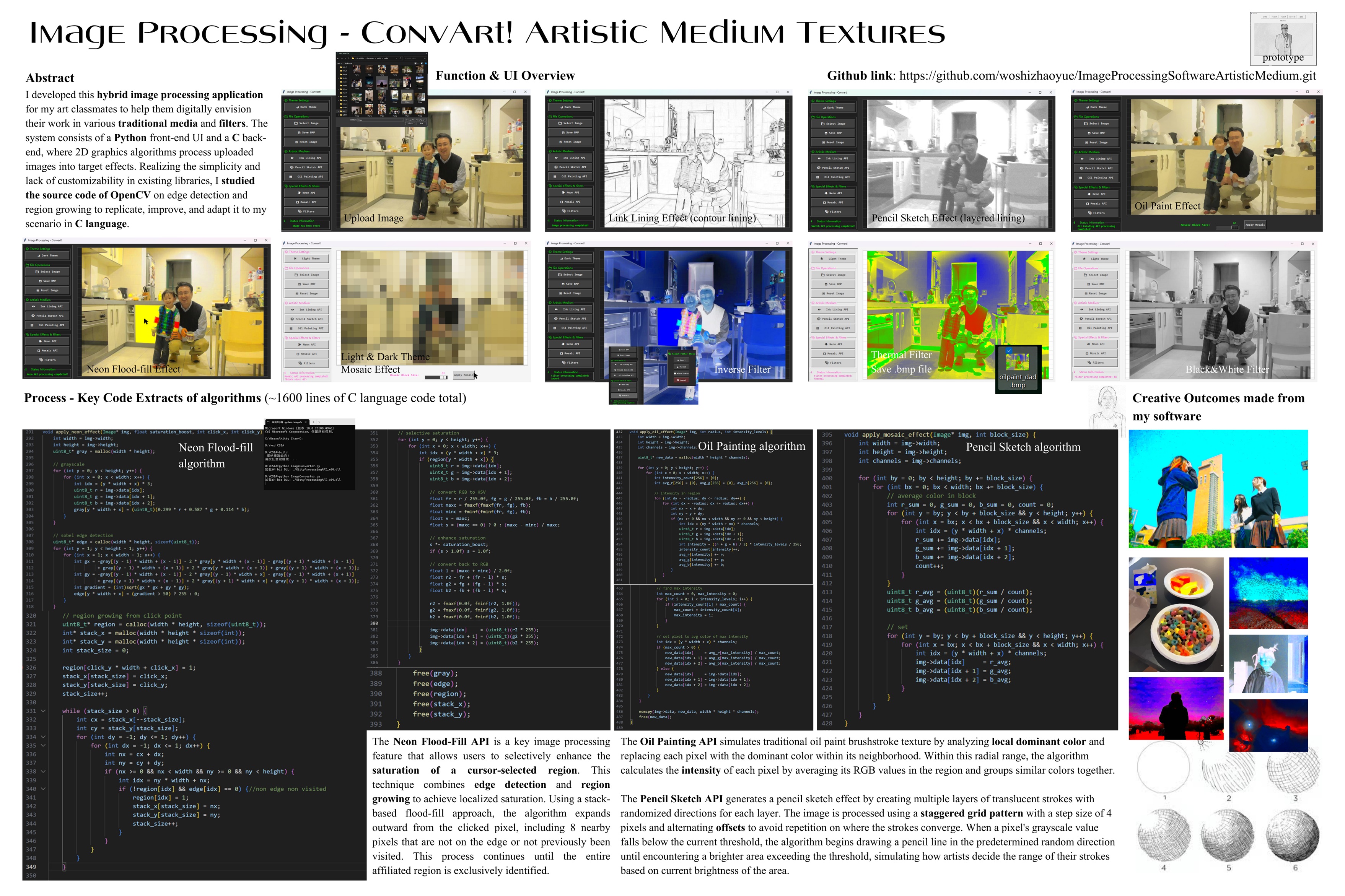 Hybrid Python-C desktop app for image processing and artistic effects experiment. Algorithm of computer science graphics are used and combined creatively to enable a tool for art students experimenting in style design and color theme design. Self-studying the online courses of computer graphics, I realize multiple functions like layered stroke rendering, local dominant color analysis dynamic region growth, and edge detection. Then I combine them into tools to present special effect on the original picture, like pencil sketch, link lining, oil paint, neon flood, thermal filter and etc.