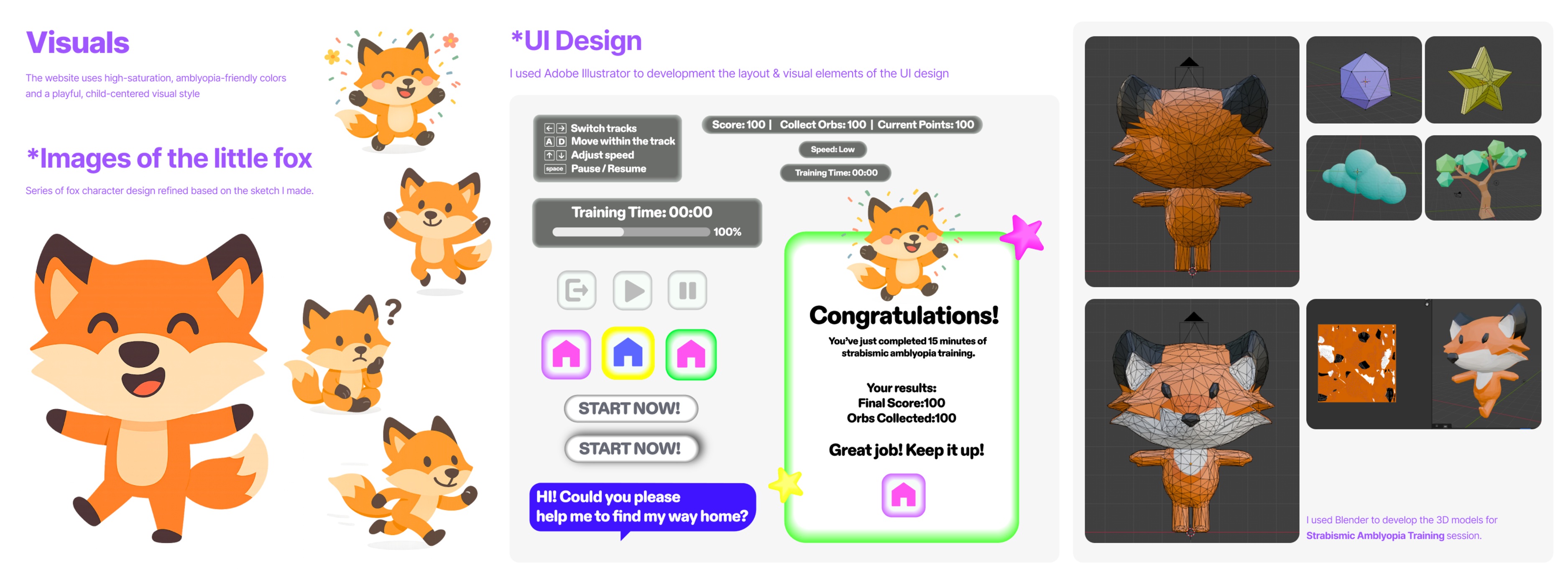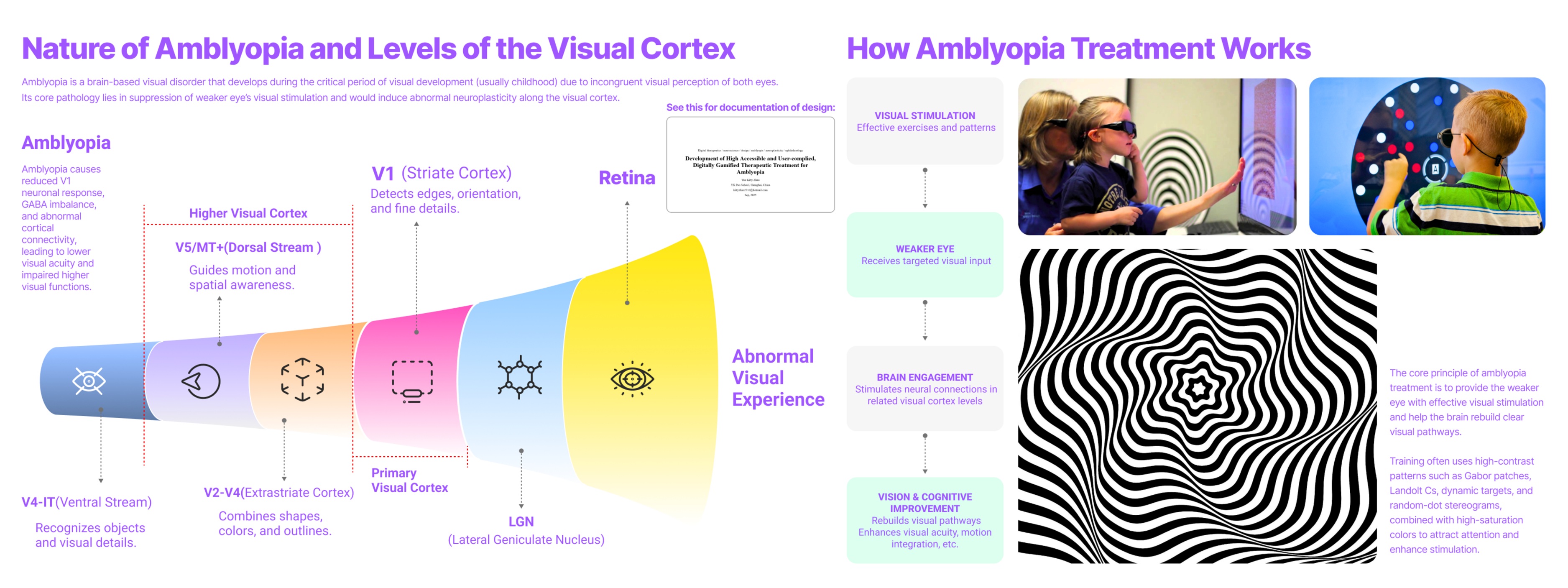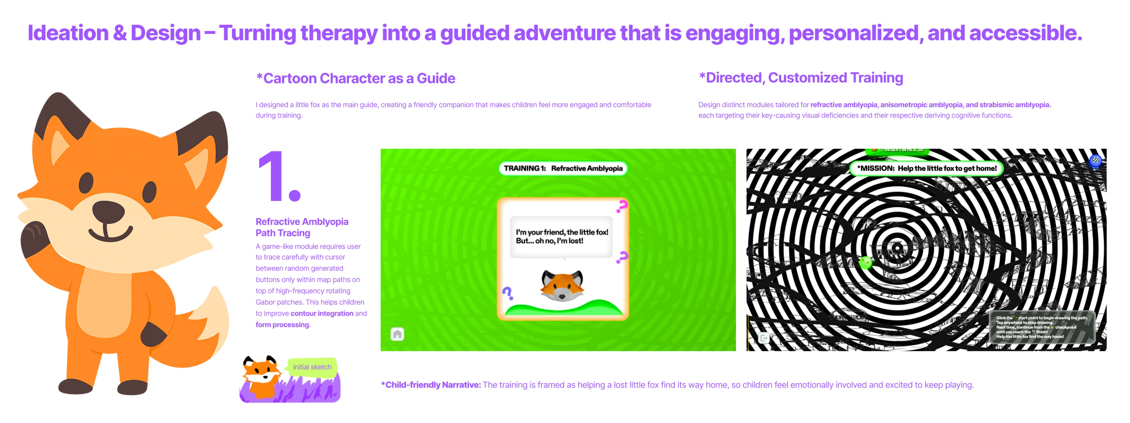 JavaScript Web-based amblyopia treatment system with three training modules targeting different amblyopia types, featuring dynamic visual pattern training and accessible interaction design; 10K+ views and 400+ users