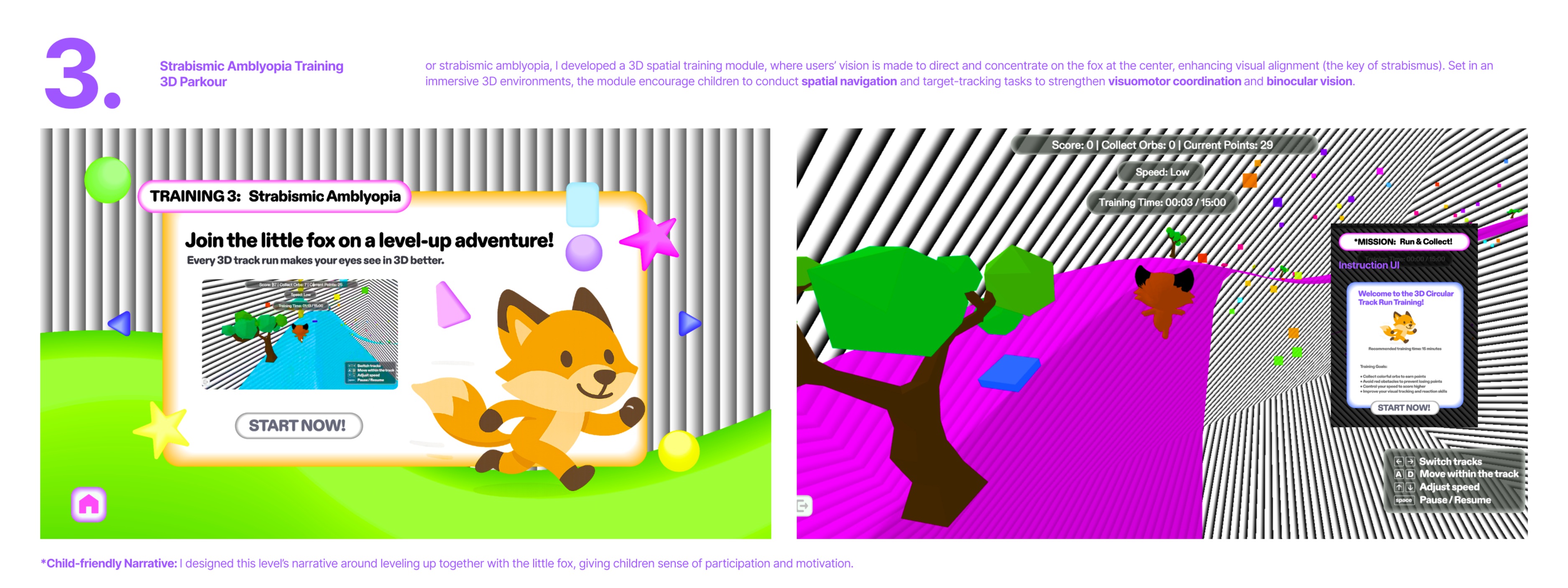 show detail >> Play WonderView >>Fun 3D video game, built on Unity, supporting strabismic amblyopia training for kids, featuring doublescreen collaboration and raytracing-based vision checks.